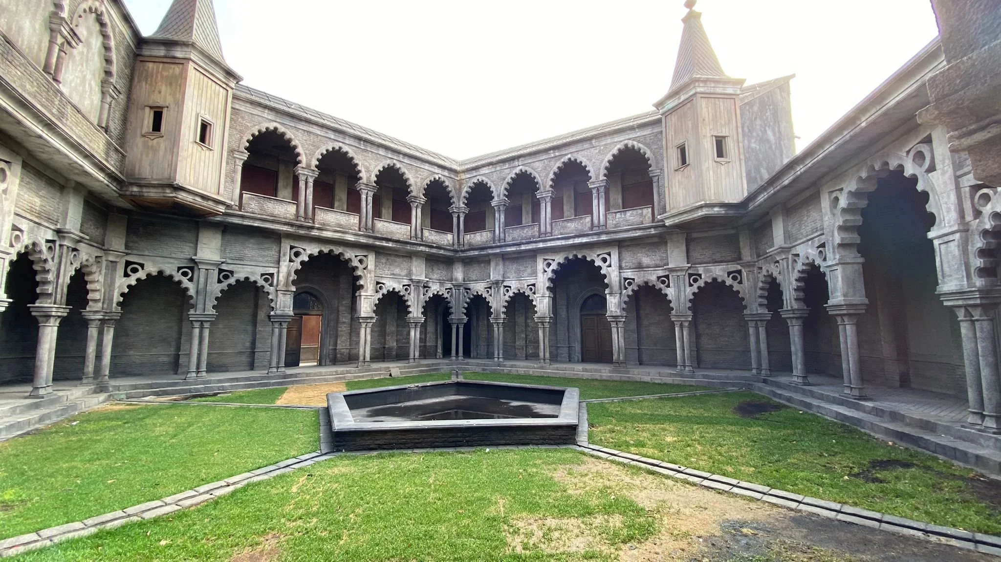“Benvenuta nel quadrato” esclama la solare Enid, “È un pentagono…” puntualizza Mercoledì. Con questo dialogo tra le neo compagne di stanza nel primo episodio scopriamo uno dei luoghi chiave della serie: il cortile della Nevermore Academy. Anche in questo caso si tratta di un set costruito presso i Buftea Studios e non di un luogo reale.