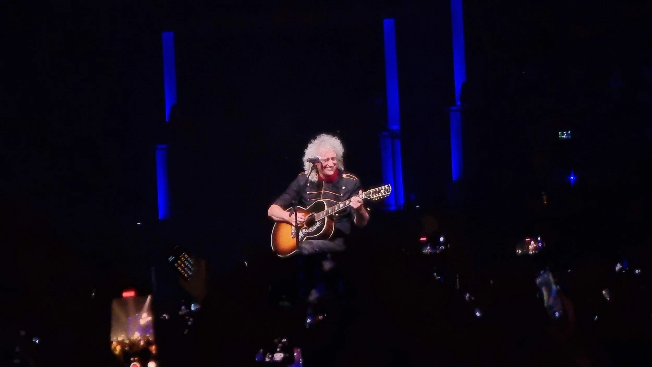 Il Rhapsody Tour si rivela da subito incredibile a livello visivo con il concerto che inizia con l’enorme logo dei Queen che si alza verso l’alto sulle note di “Innuendo” scoprendo una scenografia favolosa: un sipario di un teatro sui toni del rosso e dell’oro che si apre svelando la silhouette di Brian May che con la sua chitarra fa esplodere in un boato il pubblico dell’Unipol Arena intonando le prime note di “Now I’m Here”.